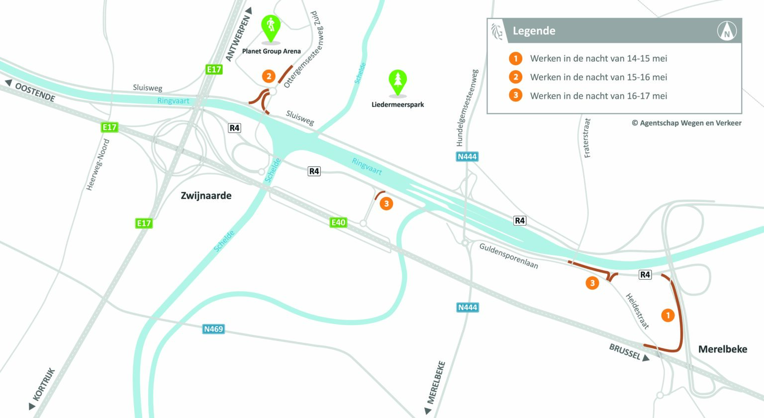 Bericht van Agentschap Wegen & Verkeer: van woensdagavond 14 mei tot en met zaterdagochtend 17 mei 2025 worden er herstellingswerken uitgevoerd aan het wegdek op verschillende locaties op en rond de Gentse Ring (R4) in Gent en Merelbeke. De werken gebeuren telkens ‘s nachts tussen 20u en 6u (met op de laatste nacht een mogelijke uitloop tot 9u) om de hinder overdag te beperken.
