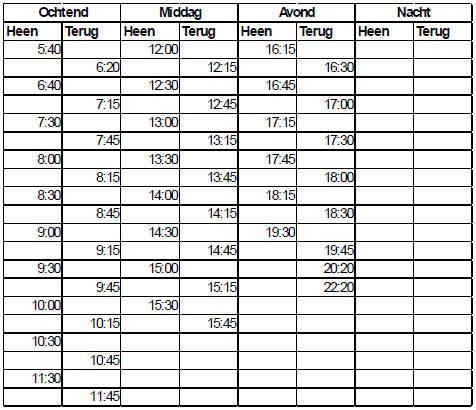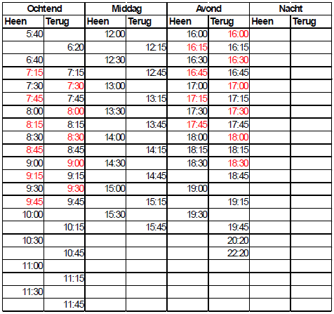 Op weekdagen rijdt de shuttle tijdens de piekuren elke 15 minuten. Op vakantiedagen is er een beperkte dienstregeling en rijdt de bus elke 30 minuten. In het weekend en op feestdagen rijdt er geen shuttle.